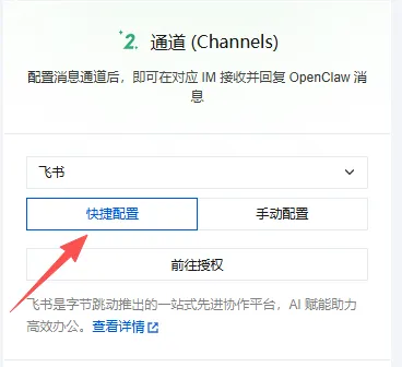 2.配置通道:“应用管理”的第2项就是通道,选择“飞书”,然后点击下方的“快捷配置”