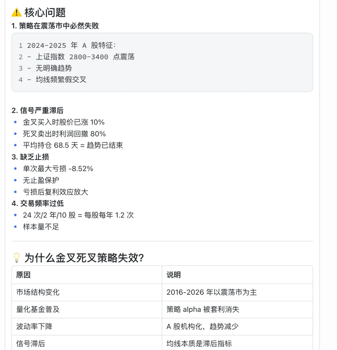 我们会发现,这时候代码已经生成了。 但回测效果不好。 接下来怎么办呢, 根据AI的提示继续优化。