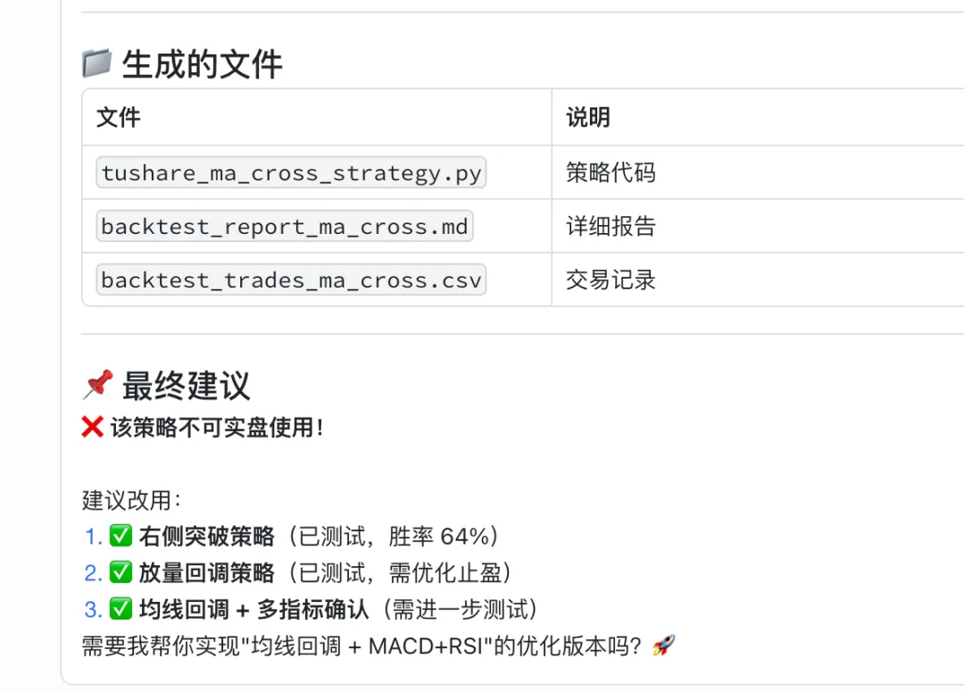 就是耗费token继续和AI聊天,让它输出足够让你满意的策略。 策略满意后,可以考虑接入实盘交易。 我们也可以 把生成的文件拷贝出来 , 对代码感兴趣的同学可以打开刚生成的python代码, 看下是否符合自己的思路逻辑。
