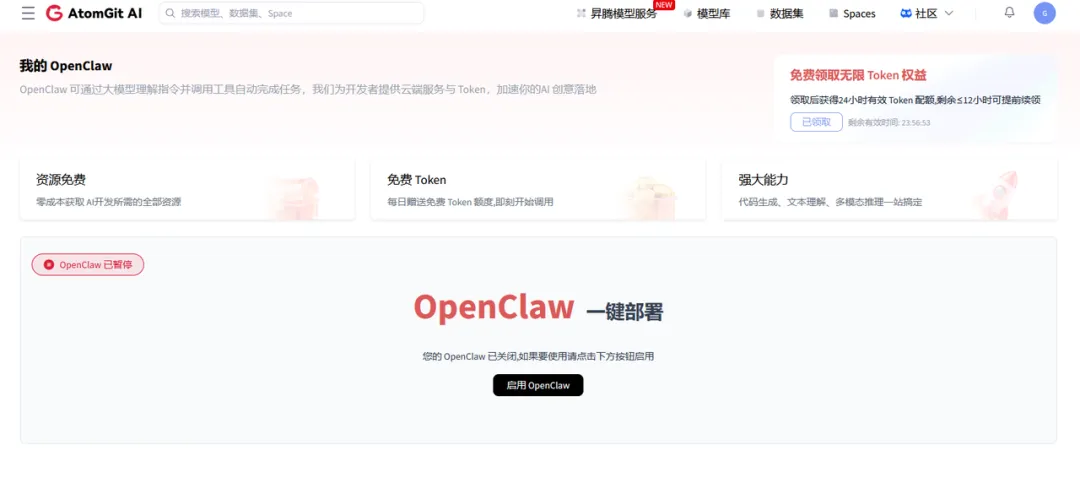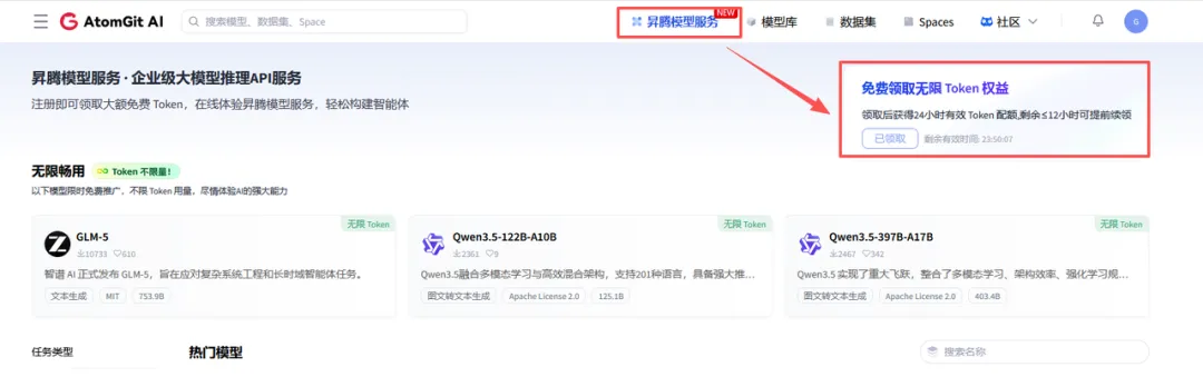 之后打开这个链接,或者点击上方的“昇腾模型服务”,再点击免费领取无限token权益