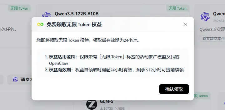 免费的模型有三种:GLM-5,Qwen3.5-122B-A10B,Qwen3.5-397B-A17B,反正都是当下top级别的,够用了。