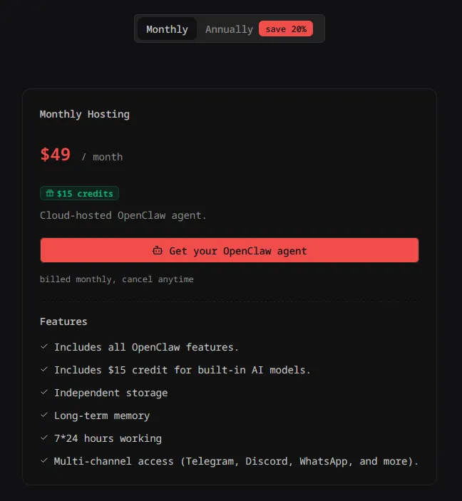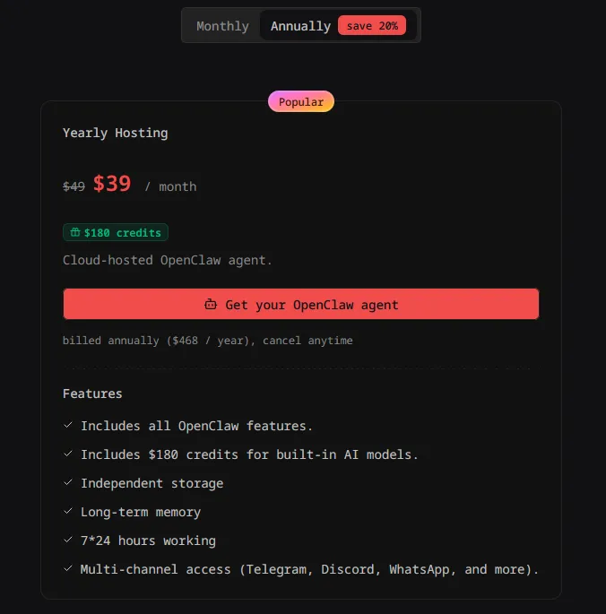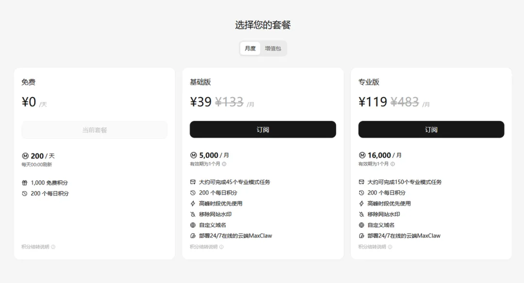 目前创建openclaw就送toeken,也就是说可以白嫖一段时间,试用一下。现在的报价是99元/月,给2000万token。