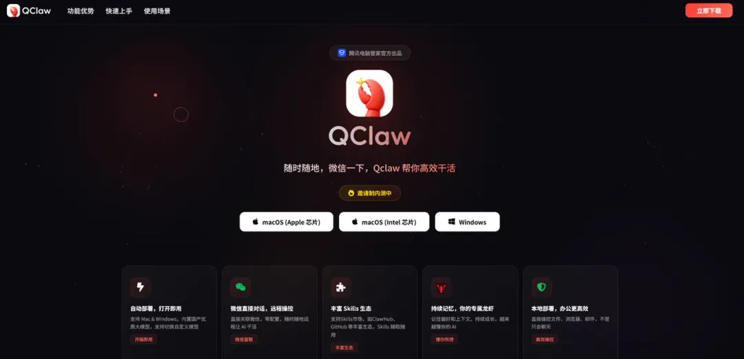 腾讯的QClaw目前还是免费的,和智谱的一样,同样要下载本地客户端。前几天还没有windows版本,没想到今天已经上架。