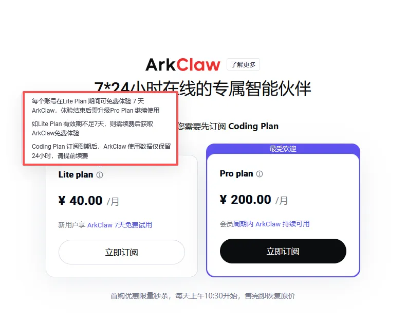 kimiClaw里面有个4.99元一周的试用版(仅限第一次购买),让大家能够低成本测试他们家的云养虾服务,还是比较贴心的。