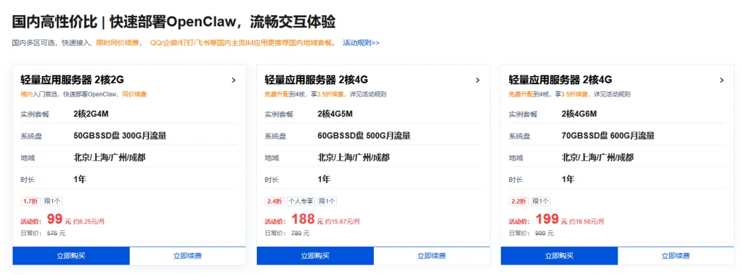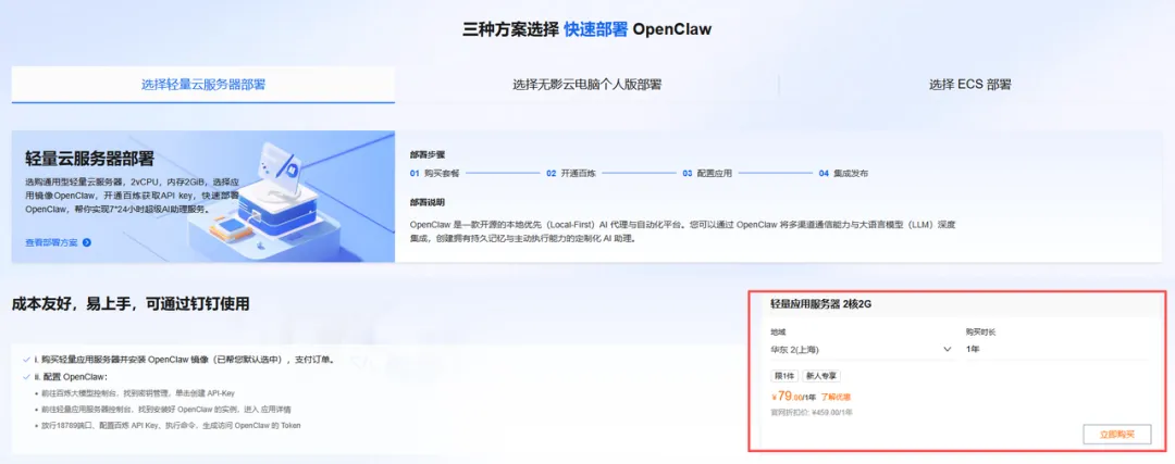 没得新人优惠也没事,阿里云的入门套餐现在79元一年,也不算贵。而且为了方便大家用小龙虾,他们还很贴心的提供预装了小龙虾的系统供客户选择。