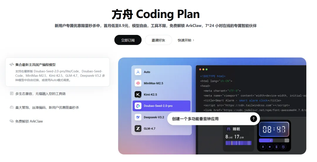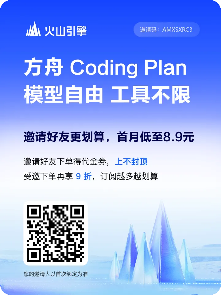 方舟 Coding Plan 支持 Doubao、GLM、DeepSeek、Kimi 等模型,工具不限,现在订阅折上9折,低至8.9元,订阅越多越划算!立即订阅:https://volcengine.com/L/3Cf28TJDAGc/ 邀请码:AMXSXRC3
