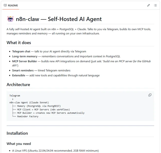 仓库中已包含 Claude.md 文件,支持通过 Claude Code 等工具直接参与开发协作。作者公开邀请社区成员测试、扩展、优化和改进该项目,共同探索在 n8n 上构建尽可能自主的 AI 智能体的可能性。
