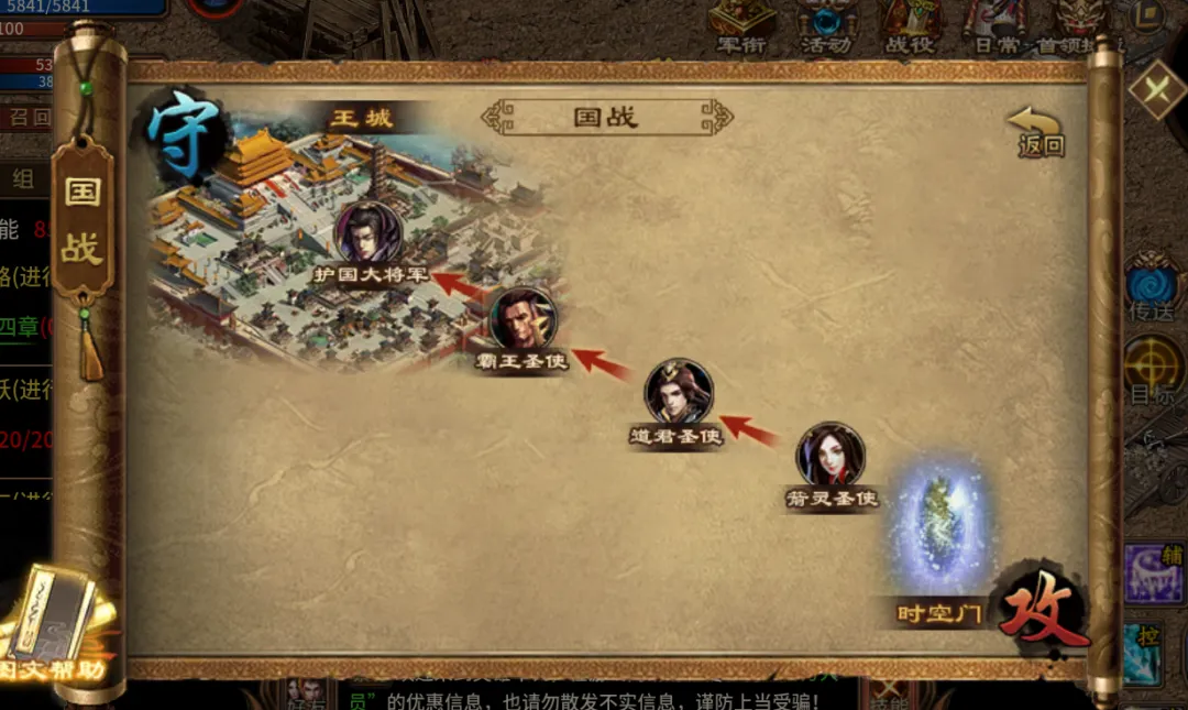 团队集结:国战前10分钟,家族、阵营全员集结,听从指挥分配任务,明确分工,避免国战开始后混乱。