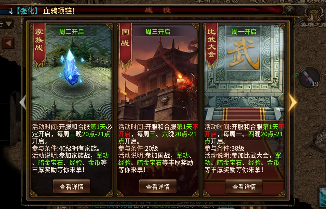 国战开启时间:每周三、周六20:00-22:00,固定时段开启,所有达到50级、加入阵营的玩家均可参与,是每周最核心的大型活动。