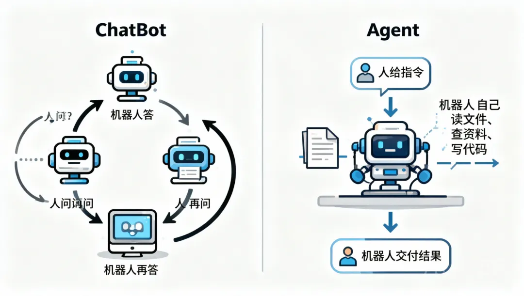 ChatBot 只回答你问的问题。Agent 不一样,它会自己"到处看":