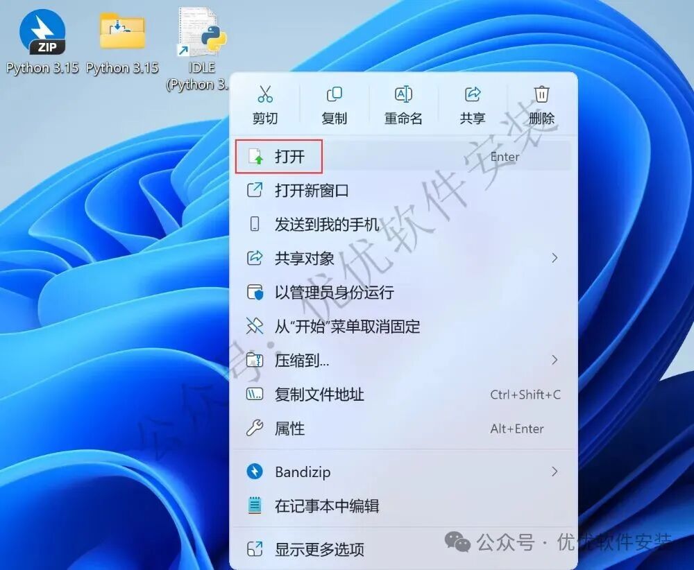 10、右键桌面上的【IDLE(Python 3.15)软件图标】,点击【打开】