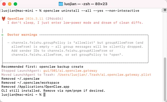 说实话,OpenClaw 的卸载体验属实不太行。一个本地 AI 工具,卸载居然要手动去六七个平台撤销授权,还有历史改名遗留的配置目录散落一地——这个产品体验是需要改进的。