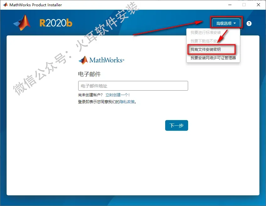 4.点击高级选项,选择“我有文件安装密钥”
