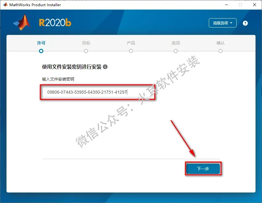 6.在输入文件安装密钥输入框中输入:09806-07443-53955-64350-21751-41297,点击“下一步”