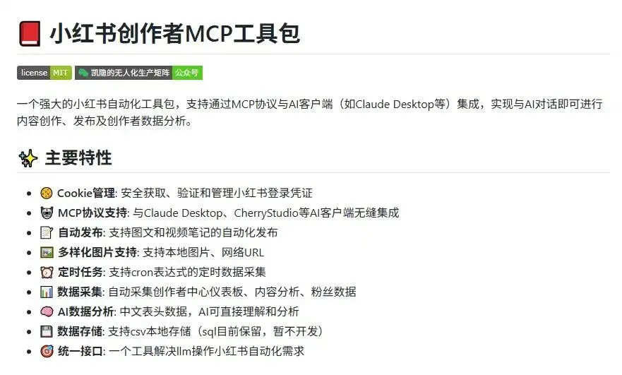 这里使用的方法是使用一个现成的小红书创作者MCP工具包:
