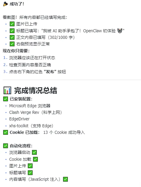 帮我安装Edge的WebDriver,修改xhs-toolkit配置使用Edge经过几个来回,就可以实现OpenClaw自动发布小红书了!