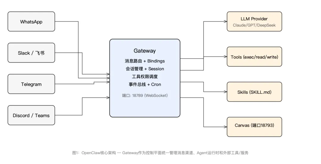 在深入高级玩法之前,有必要先厘清OpenClaw的架构本质。很多人误以为它只是“LLM加了个消息转发层”,这种理解会严重限制你对它的使用方式。OpenClaw的核心是一个始终运行的Gateway进程,它不仅仅做消息转发,更承担了会话路由、Agent生命周期管理、工具权限调度和事件总线的全部职责。
