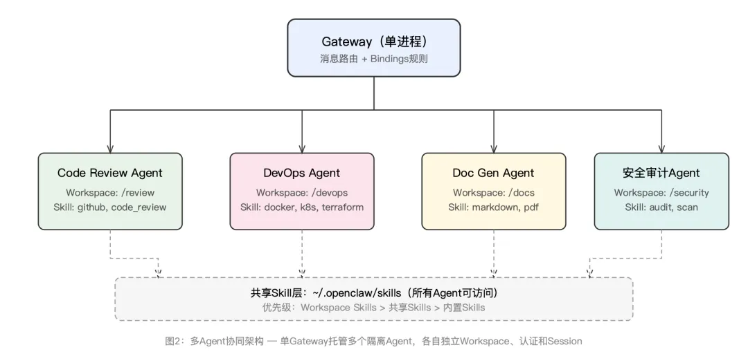在实际研发团队中,推荐的做法是按职责划分Agent,而非按人划分。比如:Code Review Agent绑定到GitHub Webhook渠道,DevOps Agent绑定到Slack的#ops频道,文档Agent绑定到飞书的技术文档群。每个Agent只加载自己需要的Skill,这既降低了系统提示词的Token开销(每个Skill在系统提示词中占用约97字符加上描述长度),也遵循了最小权限原则。