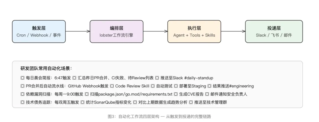 典型的工作流模式遵循一个四层结构:触发 → 编排 → 执行 → 投递。