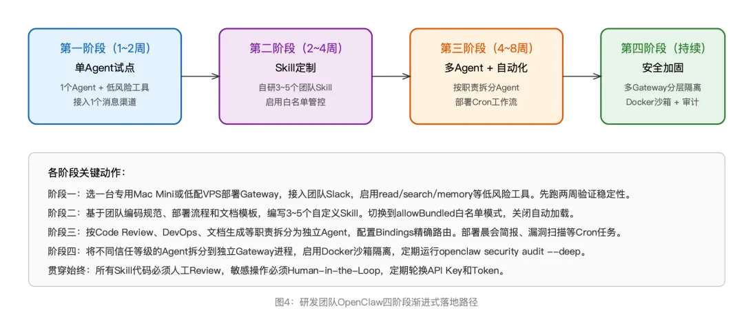 有了上面的技术储备,下面给出一条经过验证的渐进式落地路径。核心原则是先跑通、再扩展、最后收紧——不要试图一步到位地搭建完美架构。