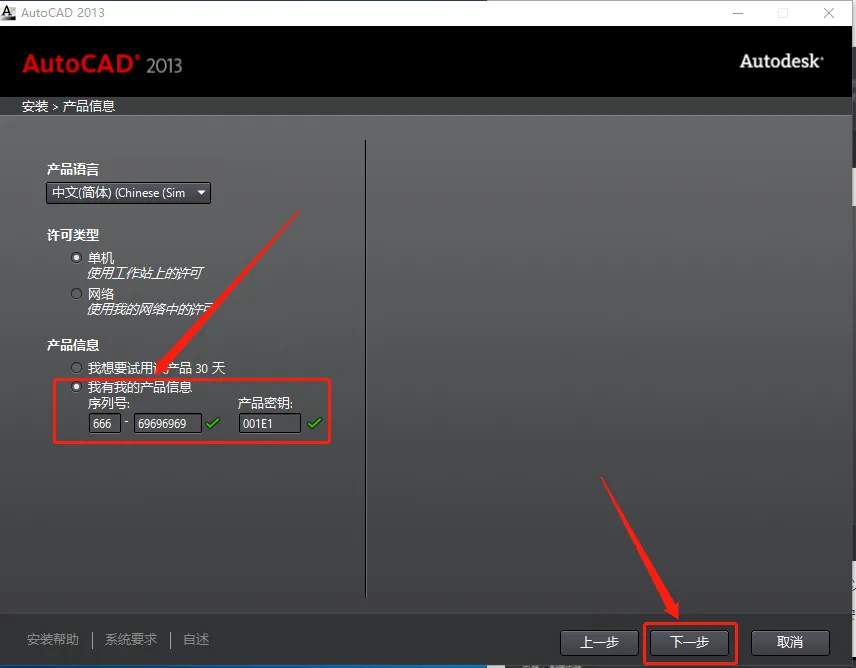 8.输入序列号:666-69696969,密钥:001E1,输入好后点击【下一步】。