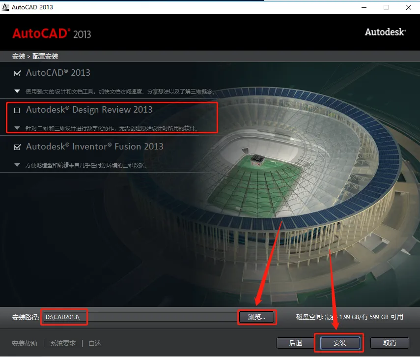 注意:这里第二项Autodesk@ Design Review 2013可以选择安装,也可以不选,建议不要选择,否则有可能导致最后安装失败。
