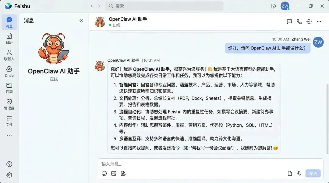 回到飞书,再次向机器人发送消息:“你好,请介绍一下你自己”