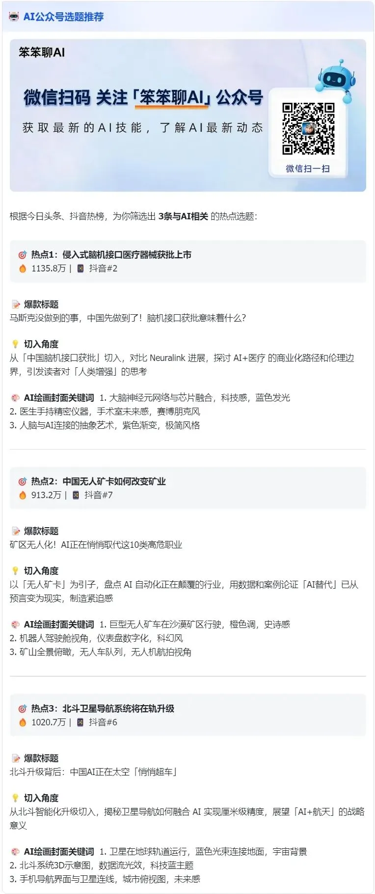 现在,每天早上打开飞书,就能收到它帮我整理好的“今日爆款选题建议”。消息里清清楚楚列好了:热点事件、爆款标题建议、切入角度。