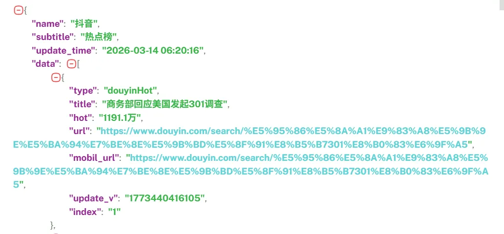 这个接口会返回 JSON 格式的数据,我们主要关注 title(标题)、hot(热度)、url(原文链接)、index(排序)这几个字段。