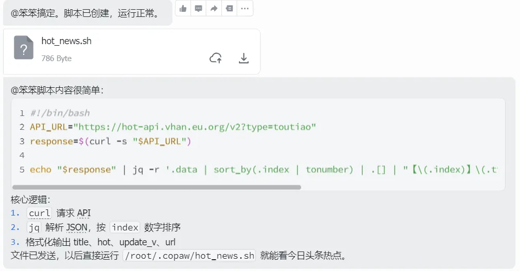 到这里已经获取到了热点新闻,但是很丑,如果只是自己使用可以直接看下面,如果你在运营自己的社区,那么接着和龙虾说让它来美化,详情可以查看这篇文章我在“养龙虾”时发现:只要15个字,让飞书消息立刻变高级