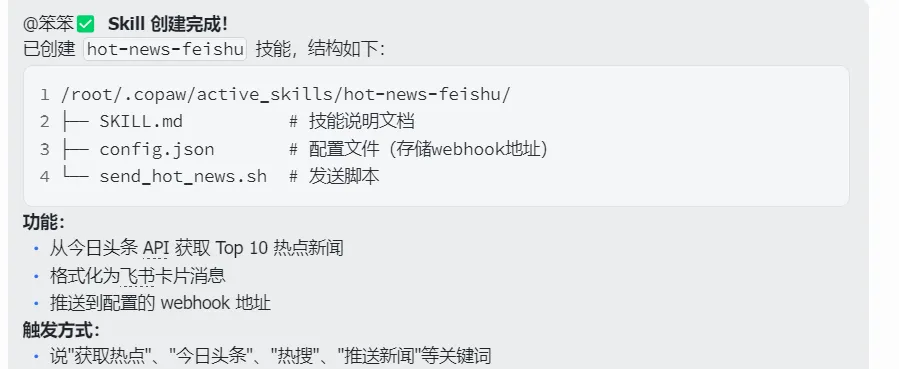 帮我创建一个skill,当我要获取热点数据的时候执行你刚创建的脚本,并把获取到的内容通过飞书卡片2.0的方式发送到对话框,同时把获取到的结果保存为json格式,每个日期一个文件