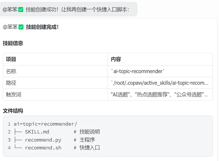 接下来再创建一个skill,这个skill的主要功能是根据你的自媒体定位来根据热点自动输出选题
