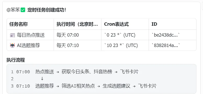创建定时任务,每天早7点执行hot-news-feishu技能;每天7点10分执行ai-topic-recommender技能让 AI 每天早上 7点自动执行热点拉取这个 Skill