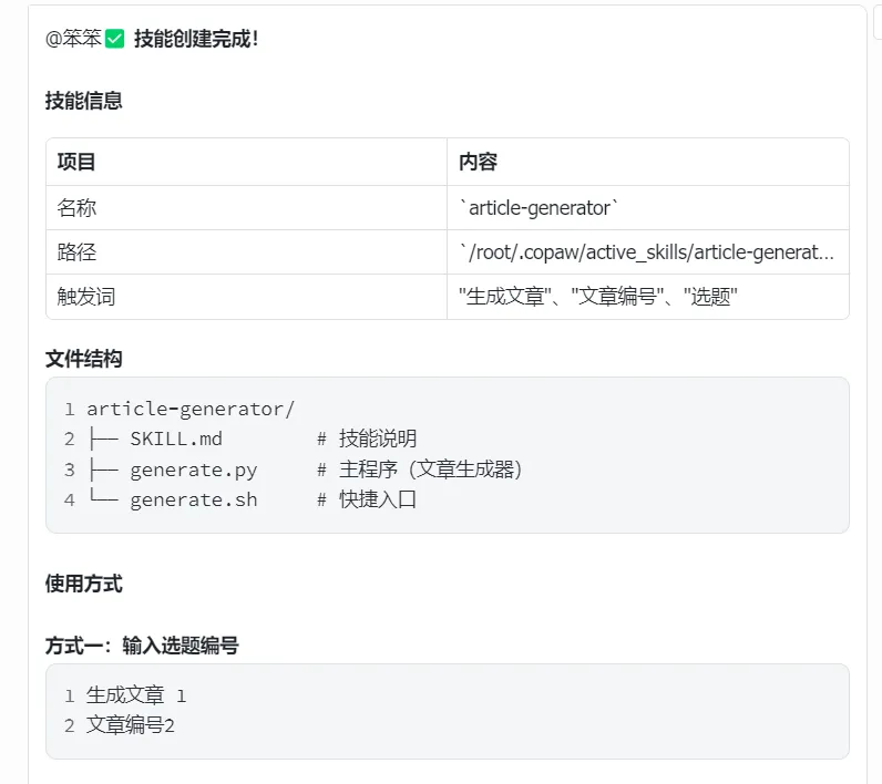 创建一个skill,当我输入选题编号或选题标题后,把选题生成具有优雅排版的、内联样式的公众号文章,公众号内容根据上面的“爆款文章结构”总框架(12段式)”进行编写,并把写好的公众号html用附件的形式发送到对话框