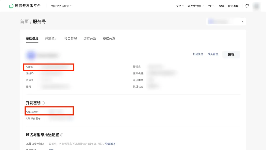 登录微信公众平台,依次进入【设置与开发 -> 基本配置】页面,获取以下关键凭证并妥善保管:
