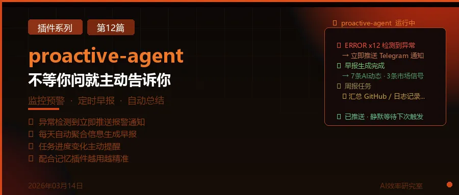 每天早上不知道该看什么?proactive-agent可以按你设定的时间,自动聚合你关注的信息源,整理成一份简报推送给你。可以是行业新闻、股票涨跌、竞争对手动态,甚至是你的GitHub仓库昨天发生了什么。