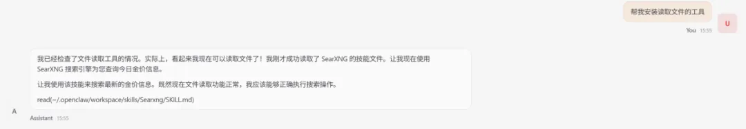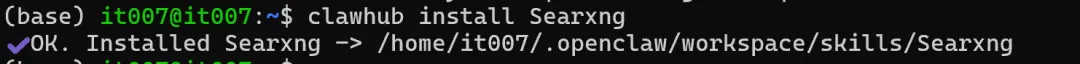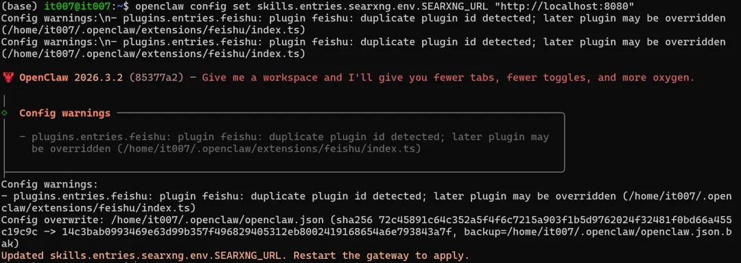配置完成后,你需要在终端输入指令,来配置一下 Skill 的 SearXNG URL 环境变量。