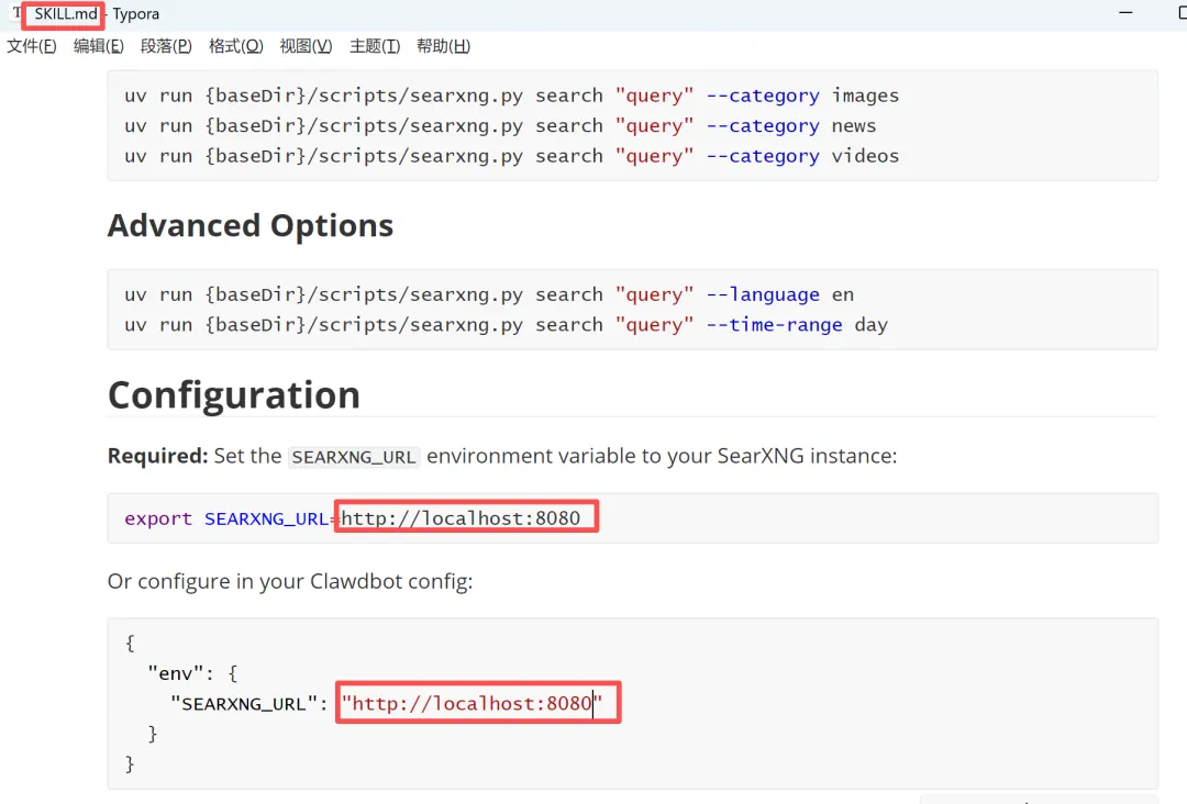 openclaw config set skills.entries.searxng.env.SEARXNG_URL "http://localhost:8080" |