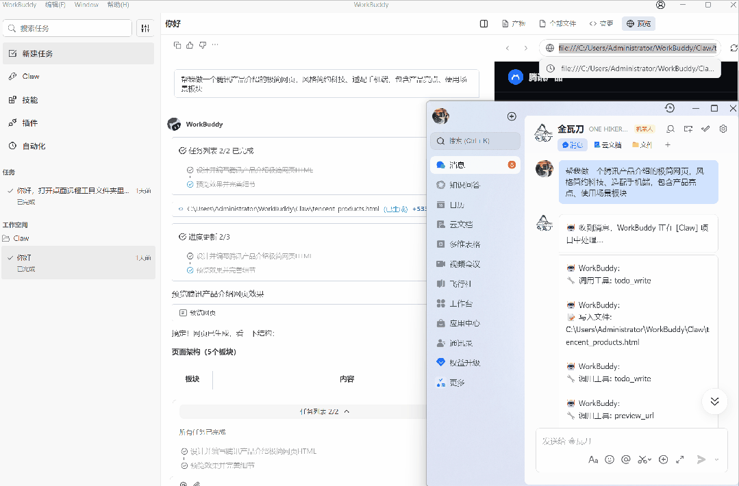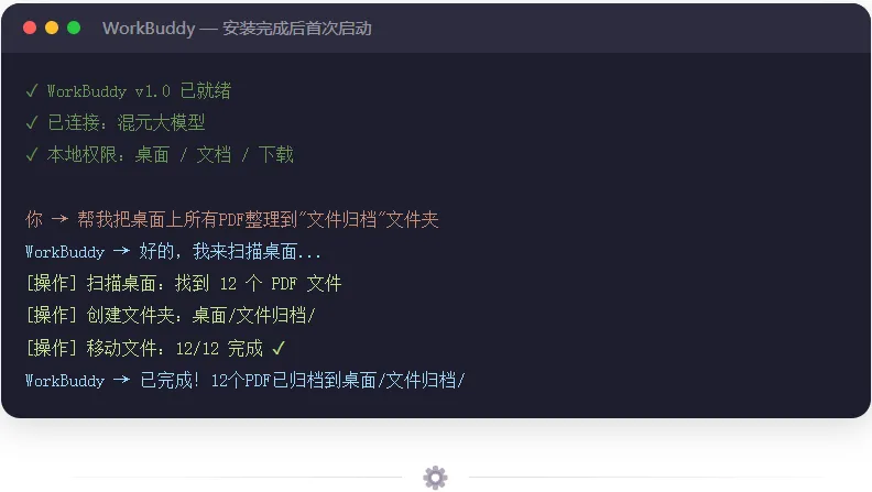 WorkBuddy 最大的亮点就是免部署。不需要装 Python、不需要配服务器、不需要命令行——就像装个普通软件一样。