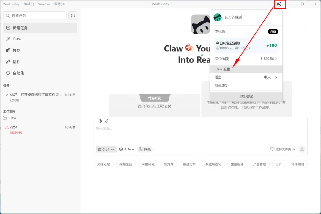 装好软件只是第一步,真正让 WorkBuddy 变强的是 Claw 设置。点击右上角头像 → 进入「Claw 设置」或可点击左侧边栏Claw菜单右侧的设置图标,这里是整个系统的控制中枢。
