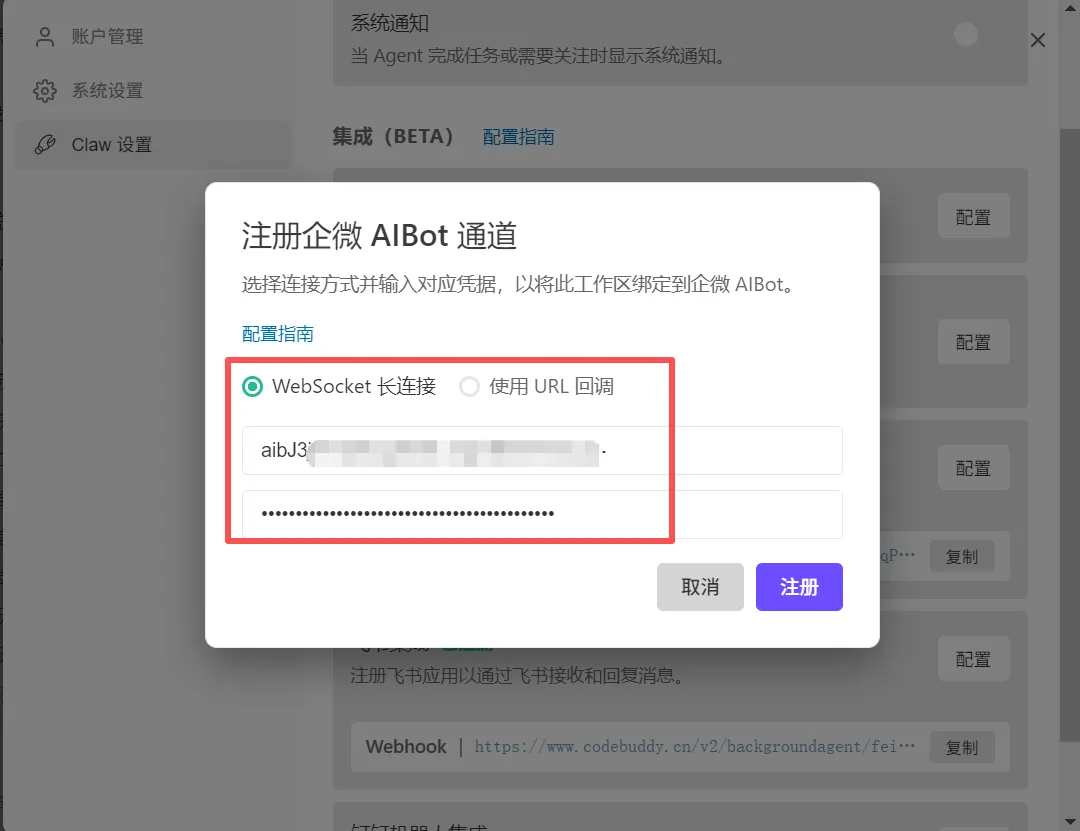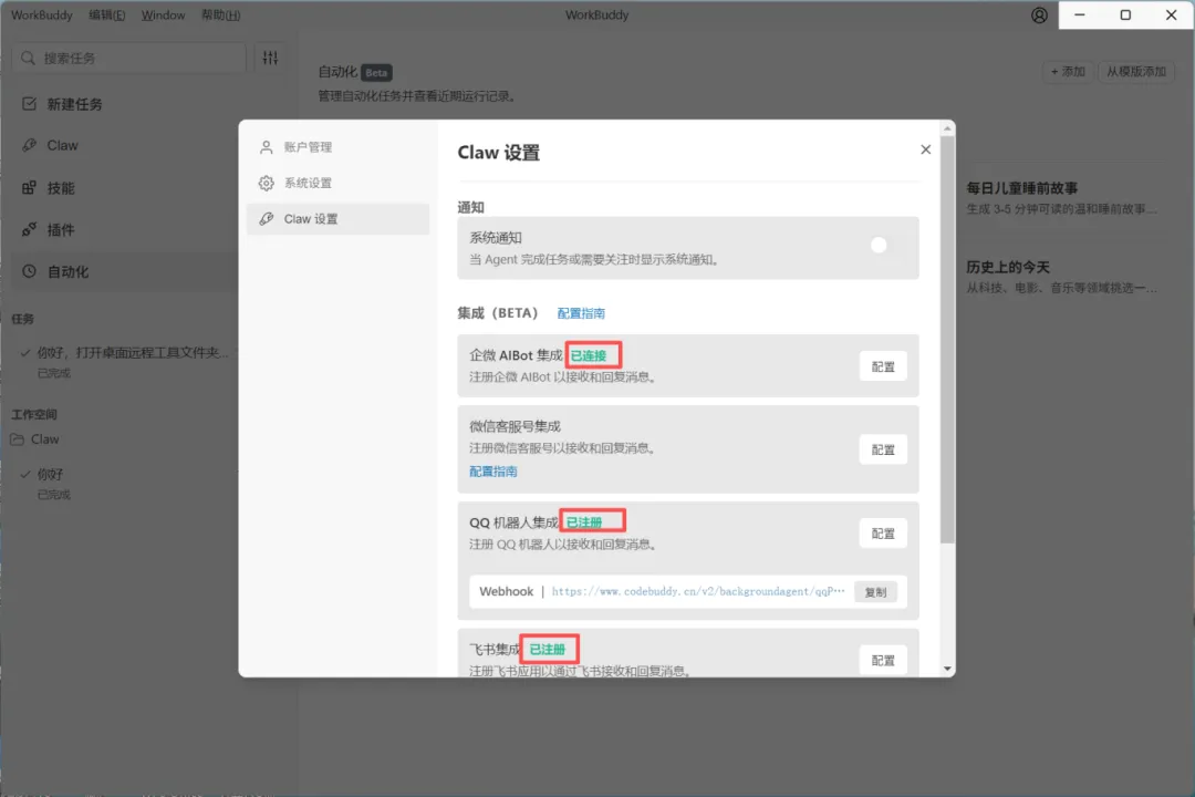 打开 WorkBuddy,点右上角头像 → 「Claw 设置」→「企微 AIBot 集成」。将刚才的 Bot ID和 Secret粘贴进对应输入框。