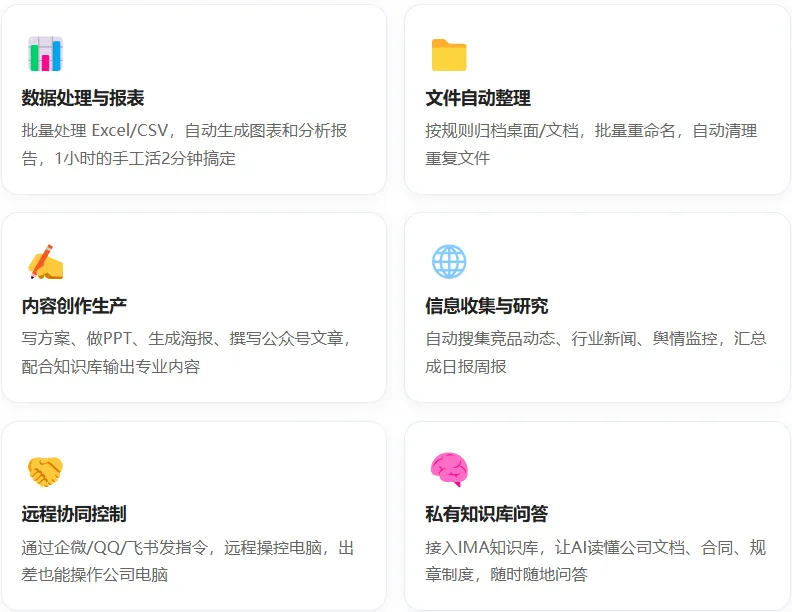 WorkBuddy 内置超过 20 种 Skills 技能包,结合 MCP 协议,几乎能覆盖日常办公的所有场景。以下是最高频的 6 类应用: