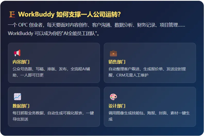 所谓 OPC,就是借助 AI 工具,让一个人能独立完成一家公司的工作量。而 WorkBuddy 正是 OPC 模式的核心基础设施。