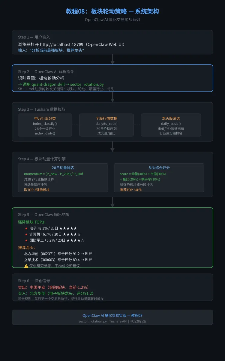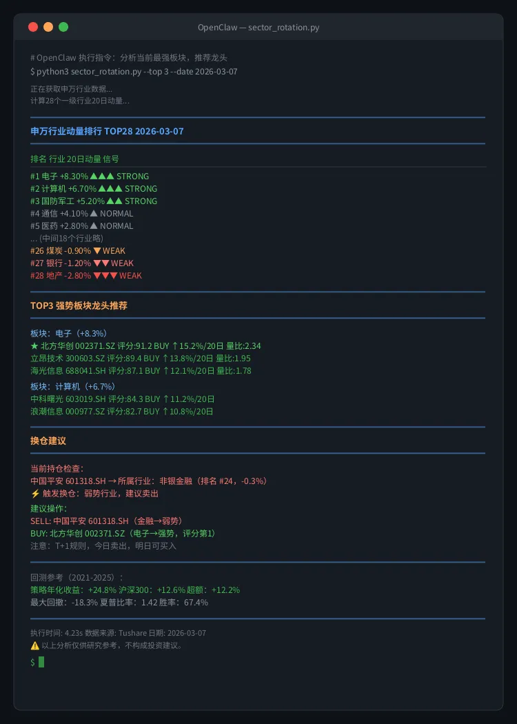 不是我手动算的。是 OpenClaw 调用 `sector_rotation.py` 自动跑的。