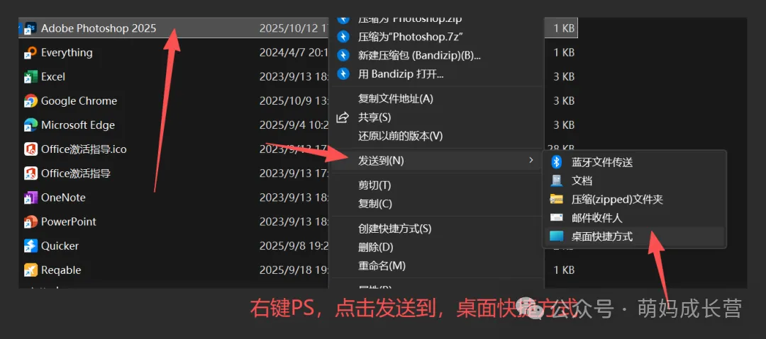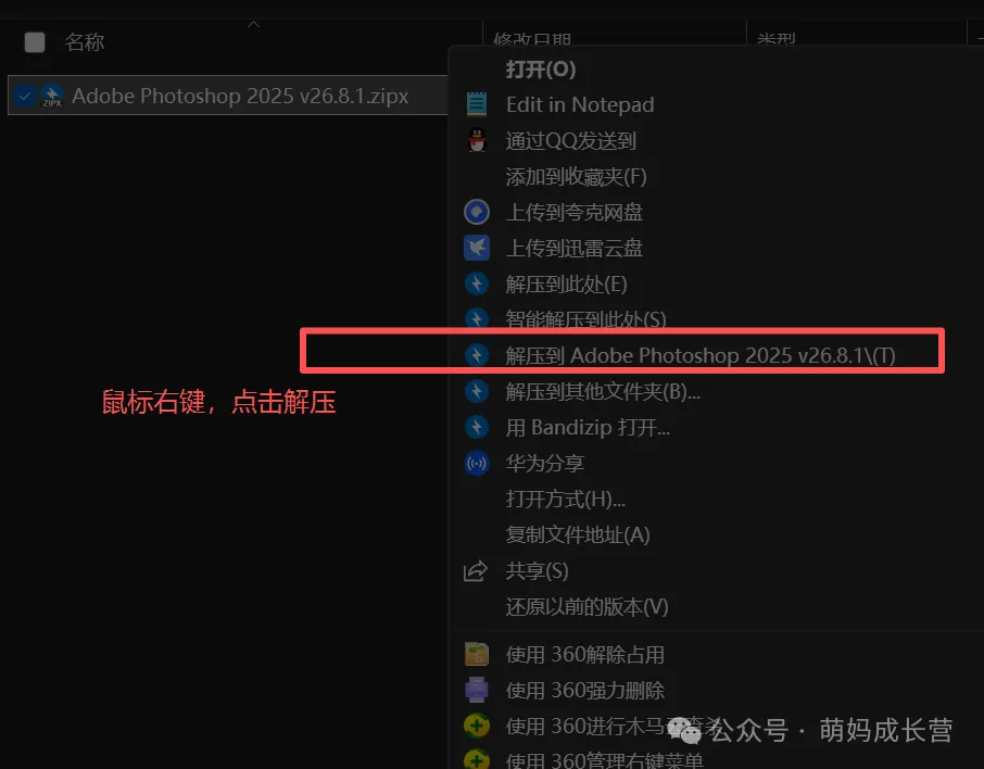 → 选择「解压到此处」(或「解压到 Adobe Photoshop 2025 v26.8.1\」),等待解压完成;(如果没有 “解压” 选项,可能需要先装解压软件,比如 Bandizip、WinRAR,官网下载免费版即可)。