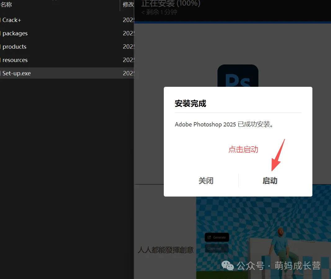 安装完成后,会弹出「Adobe Photoshop 2025 已成功安装」的提示,点击「启动」;