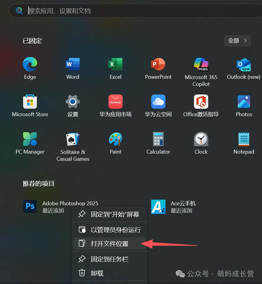 关闭 PS,点击电脑左下角「开始」菜单,在「最近添加」或「Adobe」文件夹里找到; - 右键点击 PS 图标