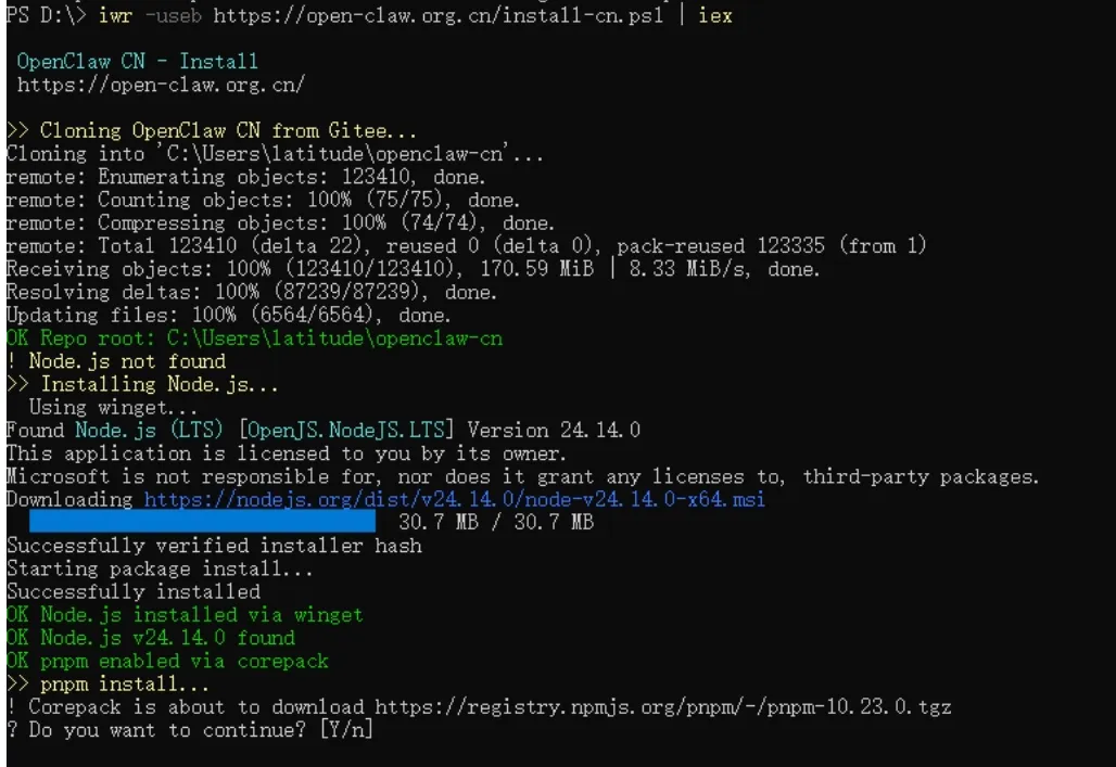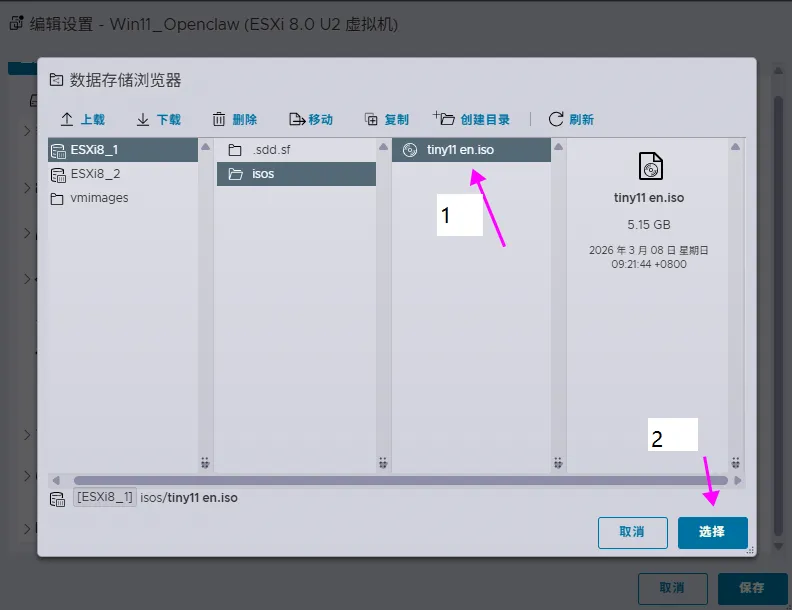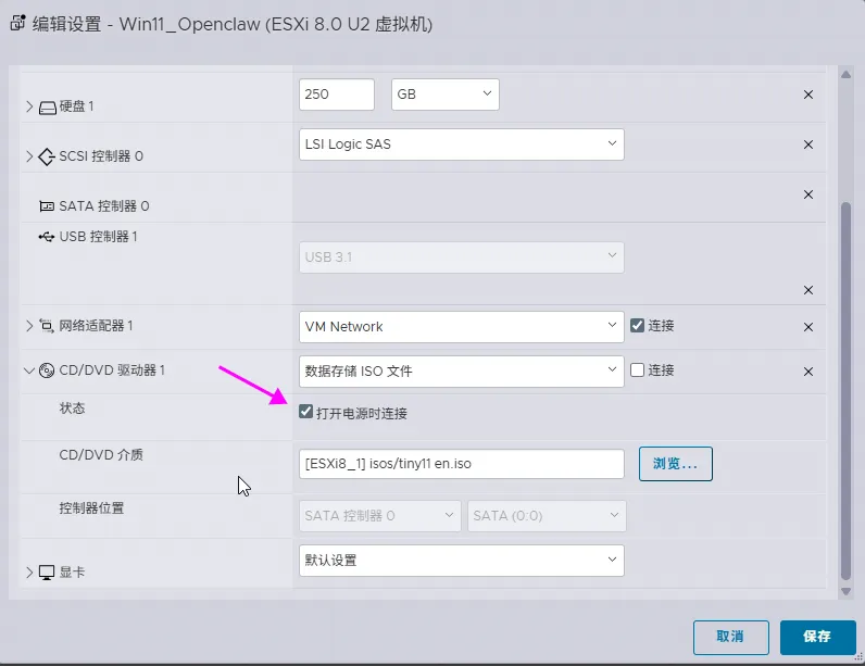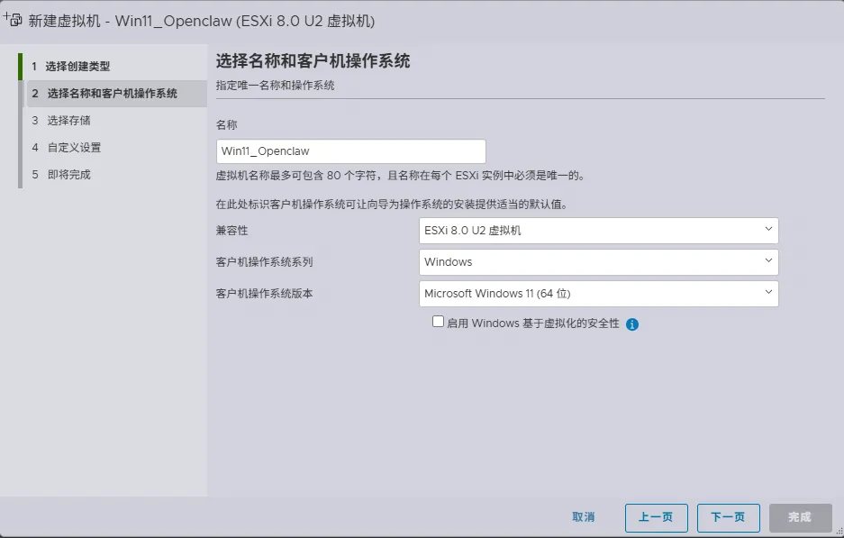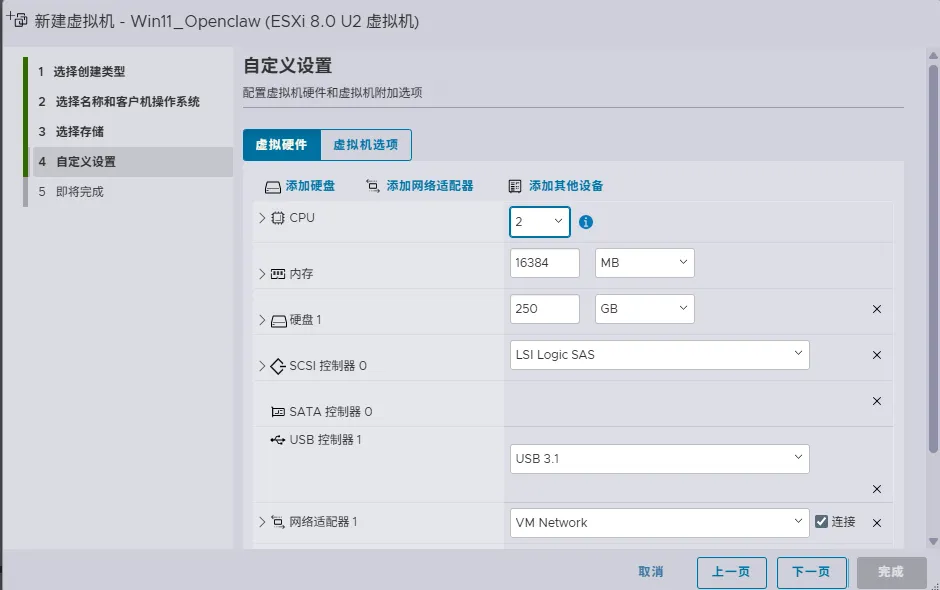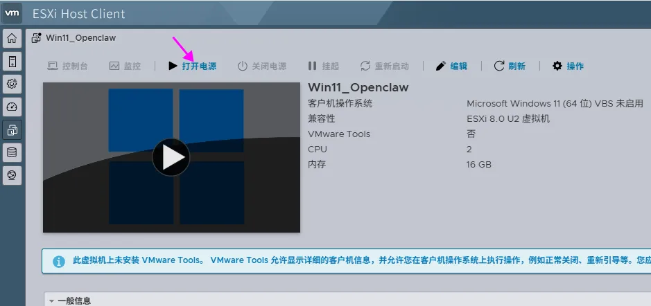 Openclaw本地虚拟化部署之前写了本地部署Openclaw,现在很多人担忧,如果安装会不会泄露隐私,本地文件这些,我觉得也有一定道理。直接在本地安装,是有可能会有这样的可能性,所以这次,我使用了虚拟机安装,目的是先在一个比较干净的环境下,逐步了解Openclaw,现投入生产环境。使用的虚拟化环境是ESXi 8.0。这个虚拟化操作系统的安装主不多讲了,只要下载对应的iso文件,推荐使用rufus刻录到U盘,然后用U盘启动,根据指示一步步安装即可。难度不大。需要注意的是,从ESXi 7.0开始不支持Realtek的网卡,建议找一块Intel pro1000的网卡,海鲜市场上40元左右就可以买一块。 自定义硬件配置,我选择了2个CPU,16G内存,250G硬盘。就是CD/DVD驱动器,要设置为数据存储的ISO文件,那个打开电源时连接一定要打上勾。然后完成。我的iso镜像是精简的win11,占用内存和磁盘空间都小,唯一不足的是英文版,不过,后面可以设置显示语言为中文。两个基本的软件还是要安装,node.js和git,然后git要设置好公钥。参见本地部署Openclaw。注意:安装的命令行一定要管理员权限。pnpm add -g openclaw@latest安装完整安装向导 + 安装系统服务 openclaw onboard --install-daemon。再强调一下,必须使用管理员模式打开命令行,否则openclaw服务会安装不成功。有一键安装的方法。以下说明一下。这个方法比较简单,推荐!Set-ExecutionPolicy RemoteSigned -Scope CurrentUser 上图中点击Yes to ALL,然后再输入以下这个:iwr -useb https://open-claw.org.cn/install-cn.ps1 | iex