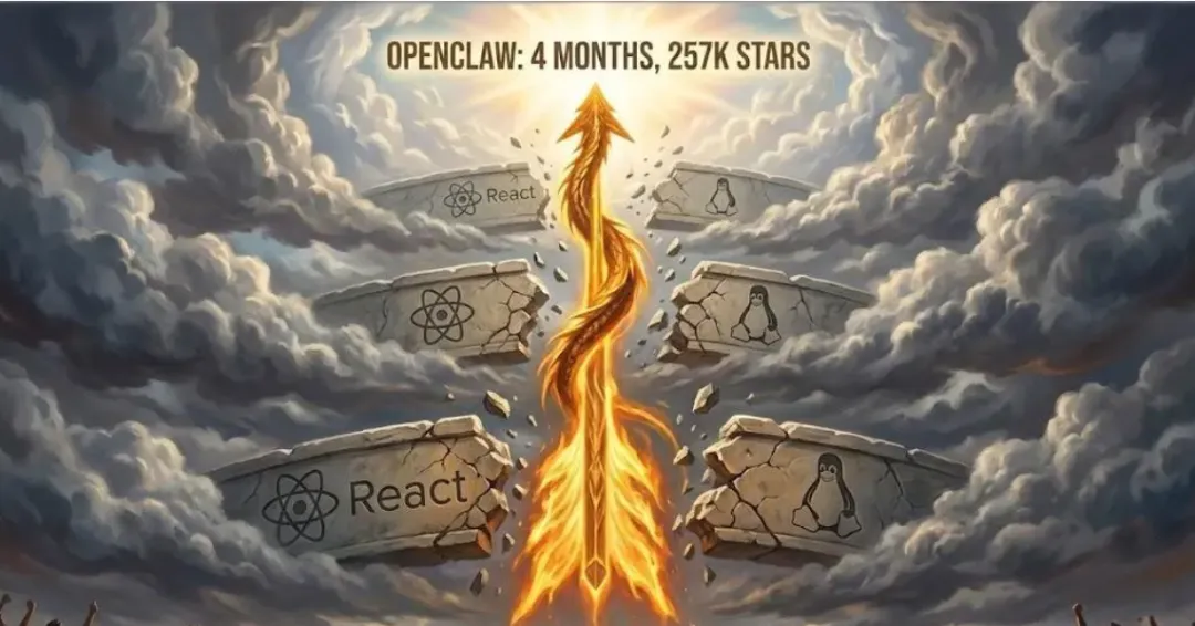 今年3月,OpenClaw 在 GitHub 上的星标数正式突破 25 万大关,超越了长期霸榜的 Web 开发框架 React。令人震惊的是,React 花了十多年才达成的成就,OpenClaw 仅用了约 60 天。