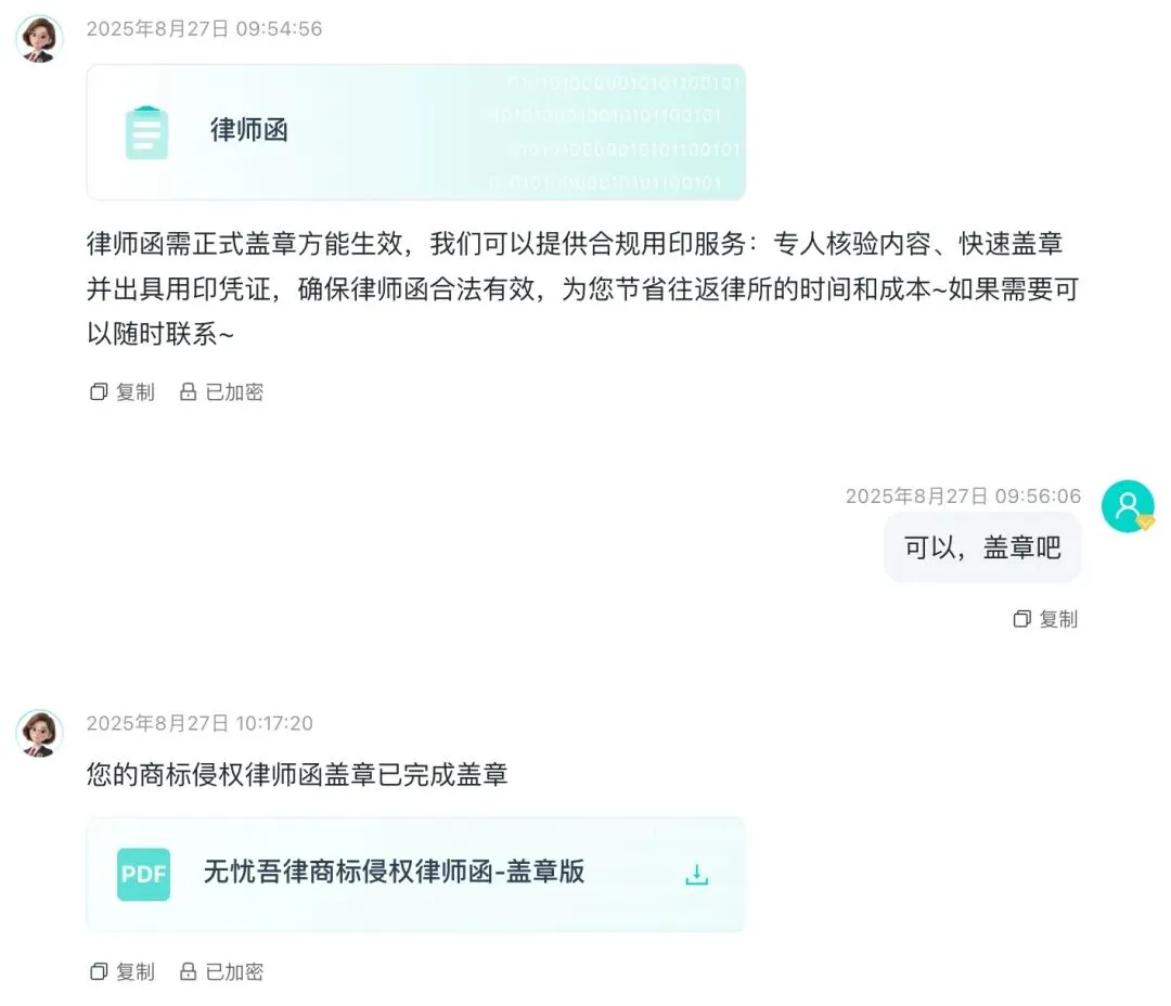 律师函全流程闭环:用户完成基础信息填报后,AI自动起草文书,经专职律师终审后完成电子签章,支持多渠道送达并自动留存送达凭证,实现全流程线上化、可追溯;